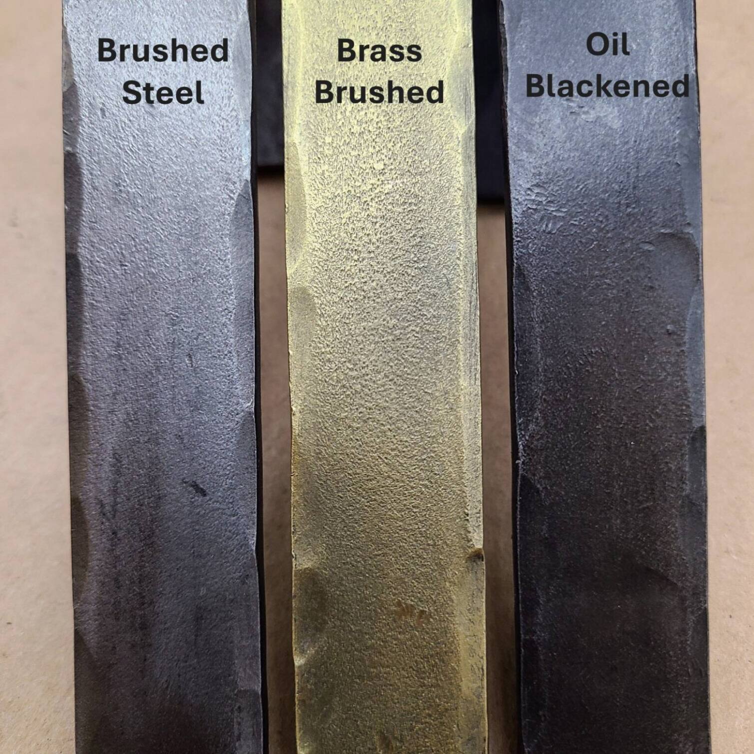 This finish is achieved by heating the piece and hand brushing using a solid brass bristle brush. The brass integrates with the steel creating a very durable and amazingly beautiful darkened brass/bronze coloration. The brush strokes are visible, contributing a visual texture to this timeless look.